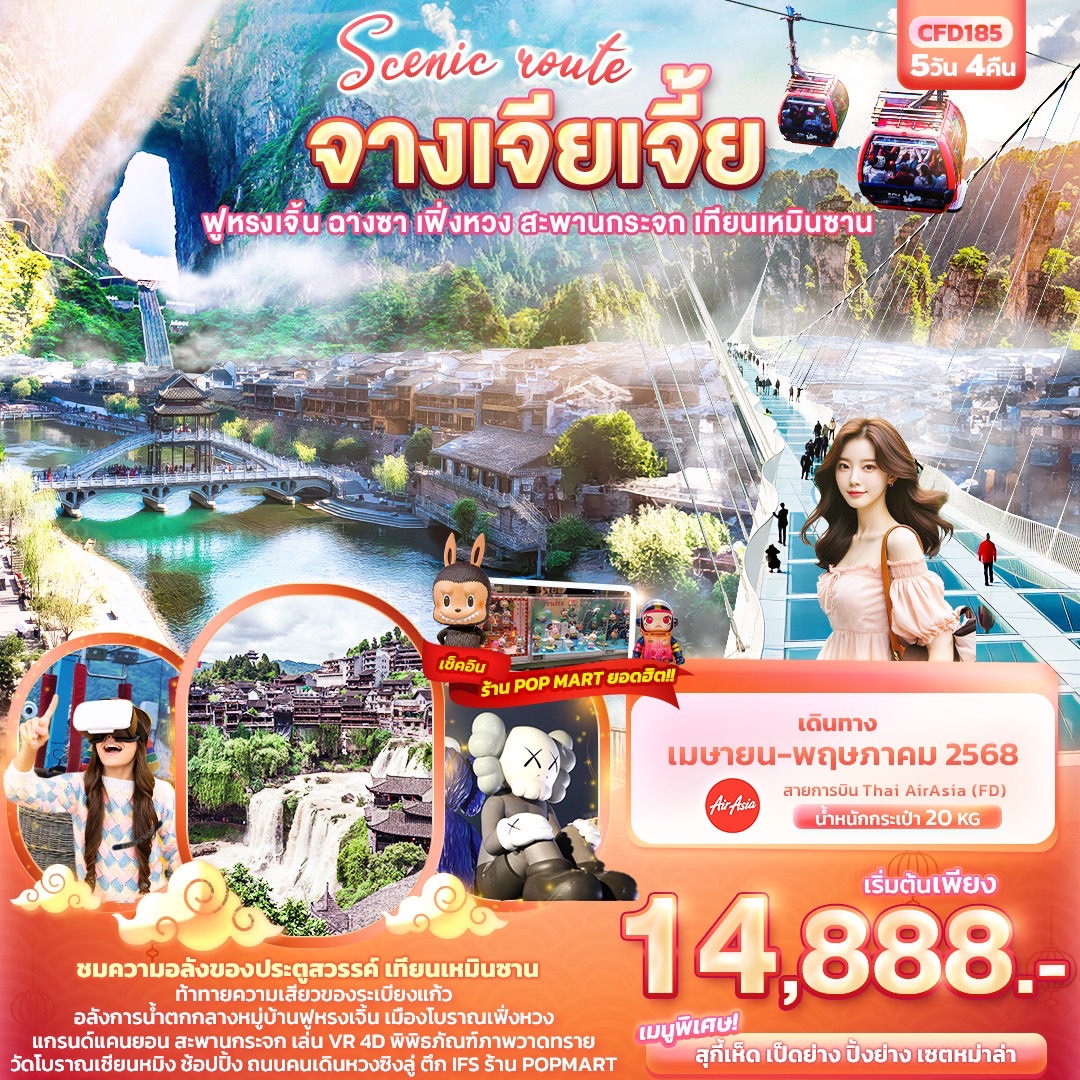 เช็คอินประตูสวรรค์ ที่เขาเทียนเหมินซาน (รวมค่ากระเช้า) ล่องเรือชมเมืองโบราณเฟิ่งหวง ชมสีสันยามค่ำคืน ที่เมืองโบราณฝูหรงเจิ้น หุบเขาอวตาร ชมสะพานอันดับหนึ่งในใต้หล้า (รวมค่ากระเช้า และลิฟต์แก้ว) เพลิดเพลินถนนโบราณ ถนนซื่อปัน Shiban Street และ ถนนคนเดินซีปู้เจีย แถมฟรีถุงผ้าท่านละ 1 ใบ